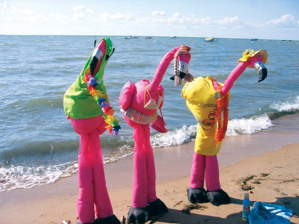 - Three revelers dressed as flamingoes pause at the shore of Saginaw Bay aft er walking in the Cheeseburger in Caseville parade. (Photo courtesy Caseville Chamber of Commerce)