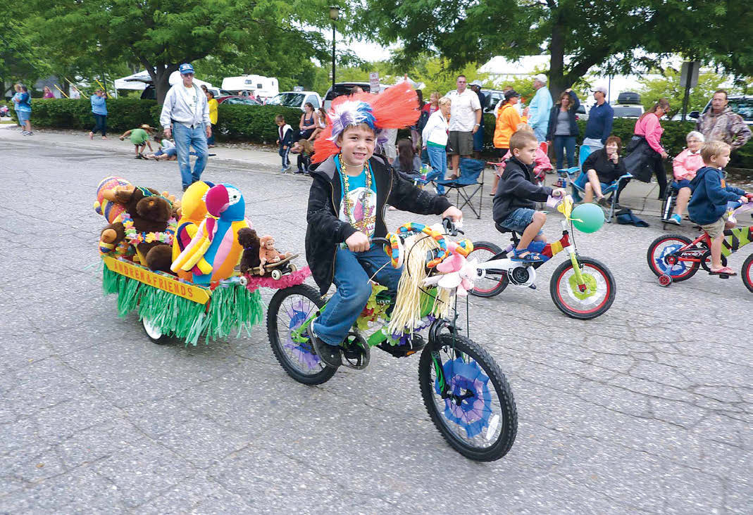- Youngsters pedal their self-decorated bicycles during the kids’ parade at Cheeseburger in Caseville, an annual celebration in Caseville, Mich. The kids’ parade takes place on a neighborhood street two days before the festival’s centerpiece, the Parade of Tropical Fools. (Photo courtesy Caseville Chamber of Commerce)