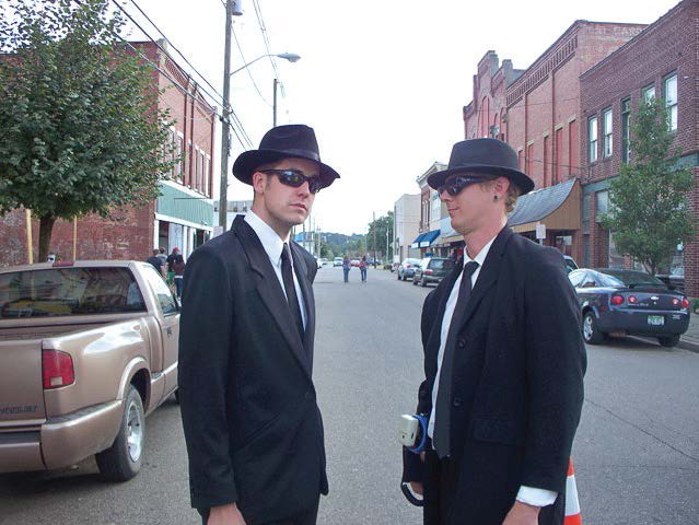 - Two “Men in Black” visitors to the Mothman Festival in Point Pleasant, W.Va., last year came prepared to eradicate the fictional threat celebrated by the town each September. (Photo provided)