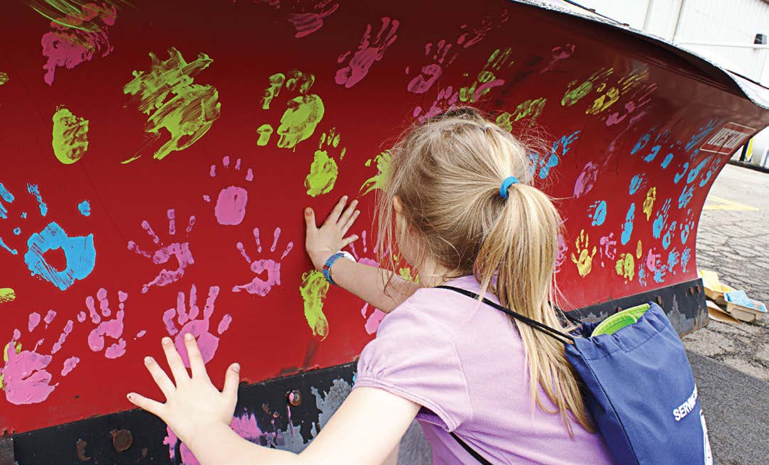 Lake in the Hills starts working on the open house several months beforehand to get information straightened out. Then staff members go into high gear the week of the event to clean up the equipment and facility. Each year they try to put a new twist on something: This year they added having visitors put painted handprints on a snowplow. Who knows what will come next?