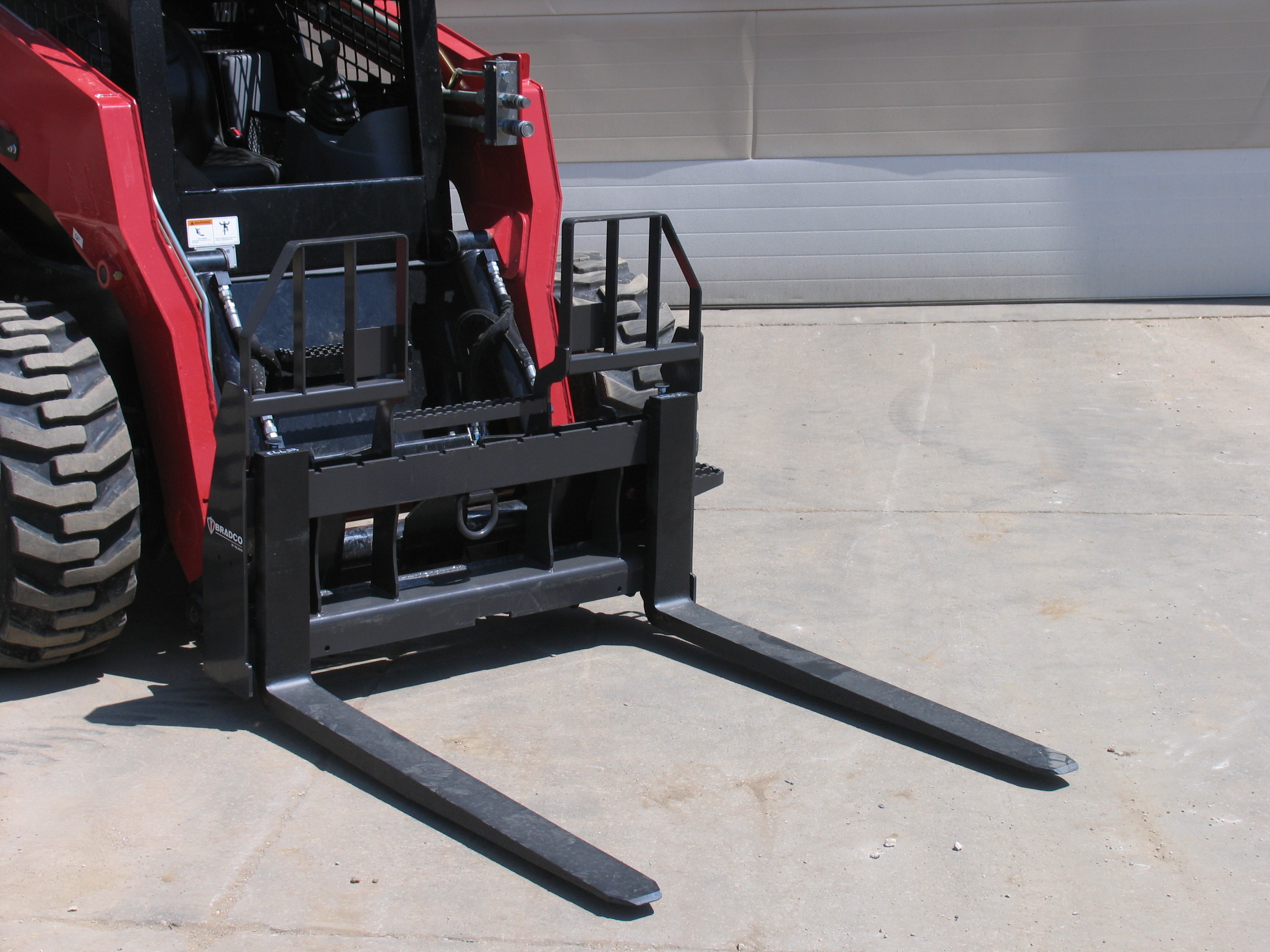 Bradco Pallet Forks have a heavy duty design for skid steer loaders handling up to a 6,200 pound capacity, with