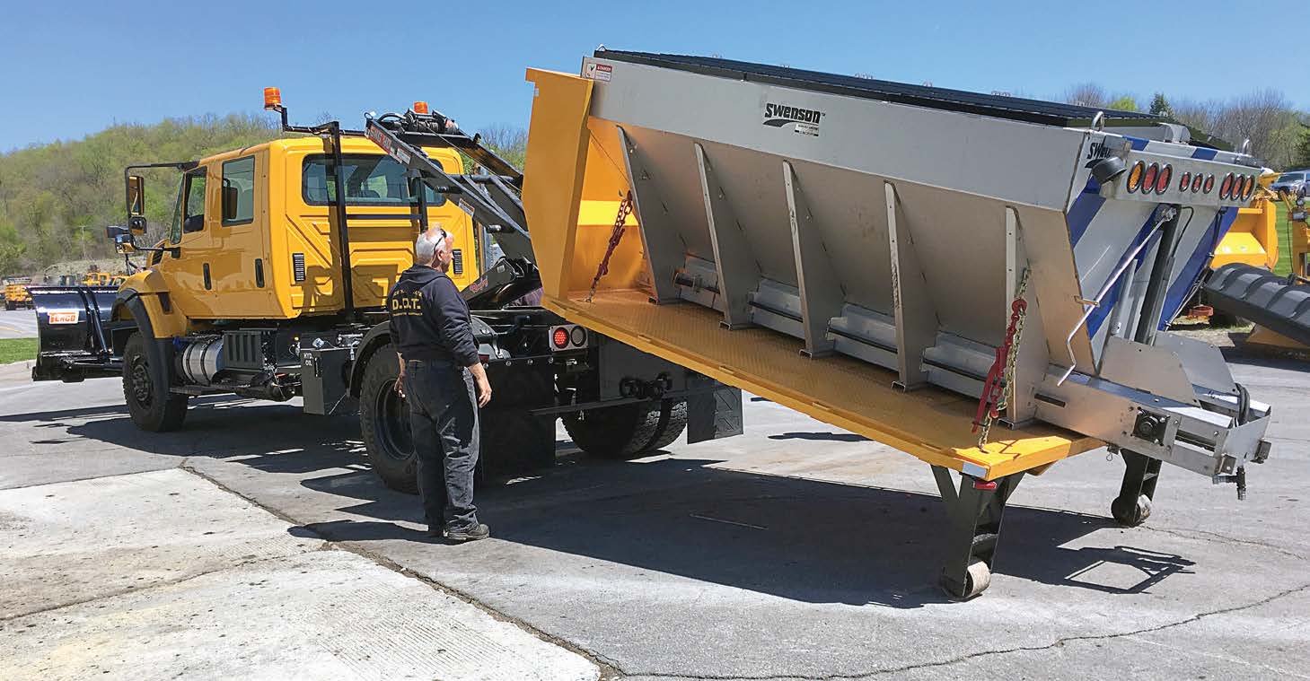 In early spring, the weather can vacillate backand- forth quite often. A warm week could be followed by a sudden snowstorm bringing several inches of snow. “The previous week, when a street crew might have been working with a dump bed on projects, they now have to scramble and fight the storm,” said Sandlin. “With SNG you can simply unload the dump bed onto the ground and pull up a V-box spreader. You’re ready to go in three minutes’ time.”
