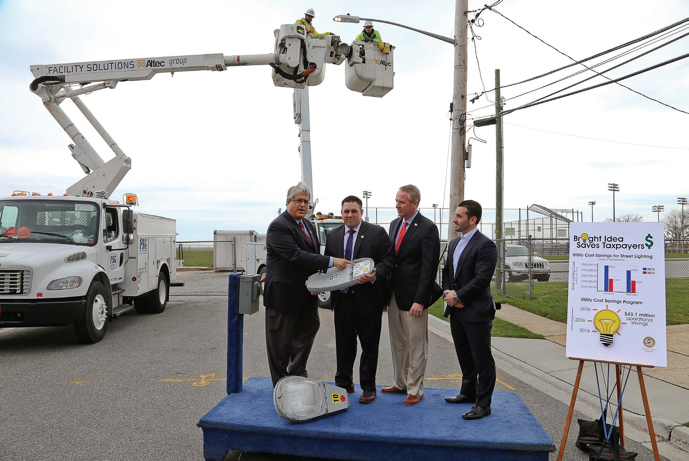 Better lighting with reduced energy is part of two projects for the town of Hempstead, N.Y. The town’s 50,000 streetlights have been retrofitted with LED fixtures. They are paying $17.7 million and plan to have a total net utility and operational savings of $43.1 million after factoring in all costs over a 20-year period. Private sector partner Facility Solutions Group is working with Hempstead work crews to replace the lights.