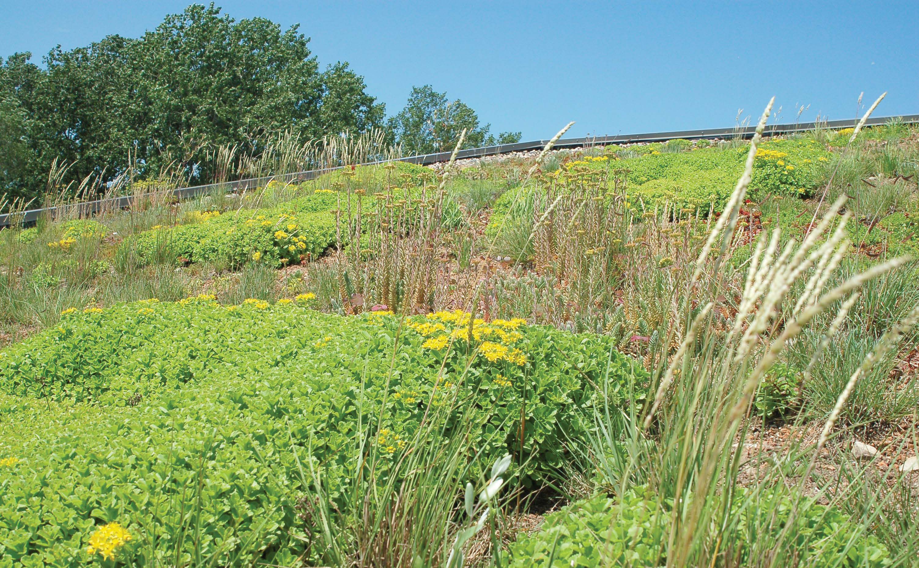 “The roof is designed at a 3:12 pitch (the extreme limit of pitch recommended at the time) with a very shallow growth medium thickness of 2 inches. We installed about 50 percent Minnesota native plants and 50 percent sedums. With these rather extreme conditions, we had some difficulty getting good plant establishment initially.”