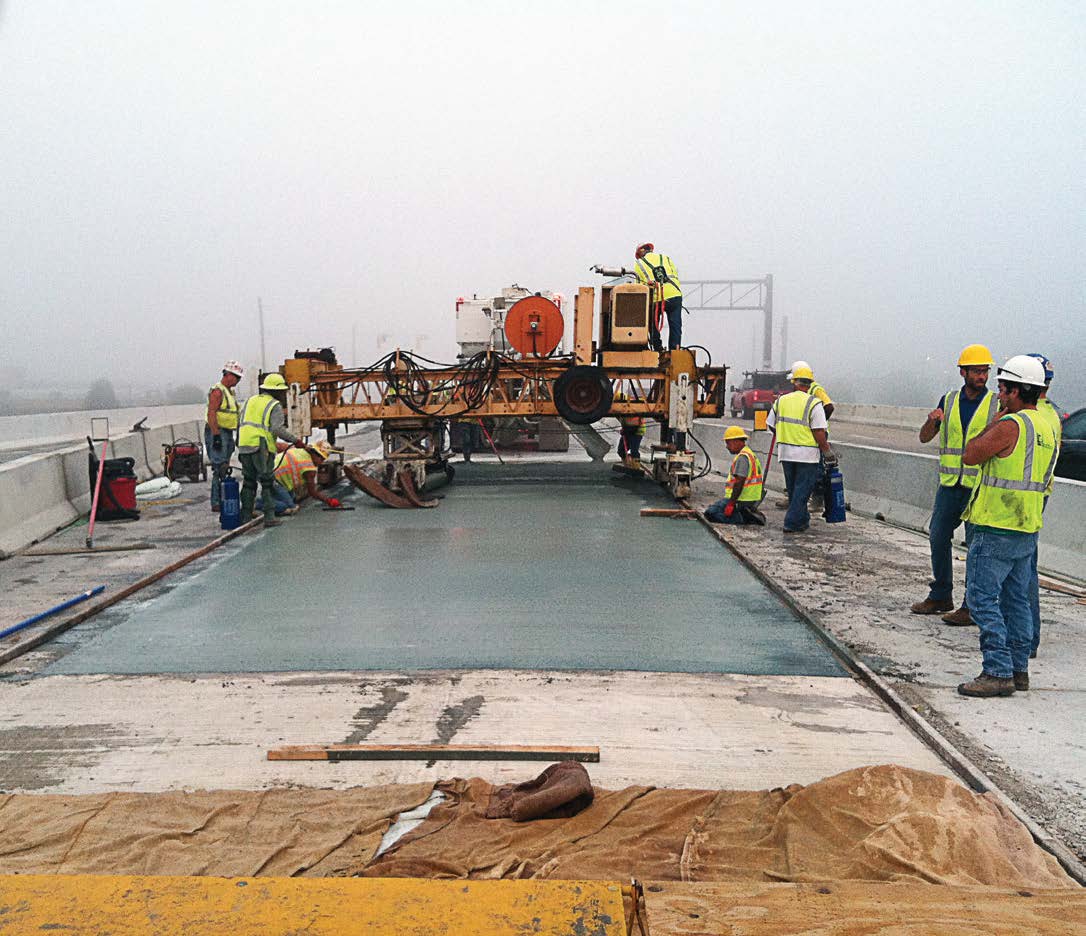 - Contractors hand-level the concrete as they complete the bridge deck overlay on the I-69/SR 1 project in Fort Wayne, Ind. (Photo provided by INDOT)