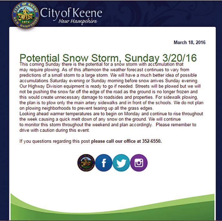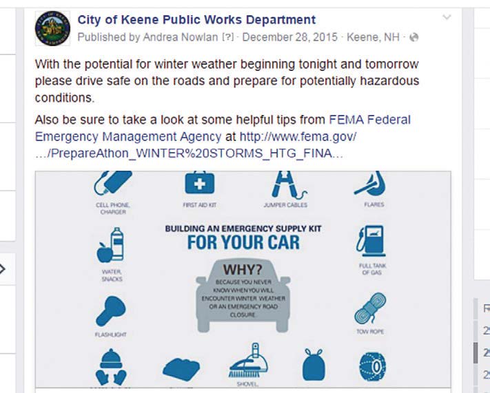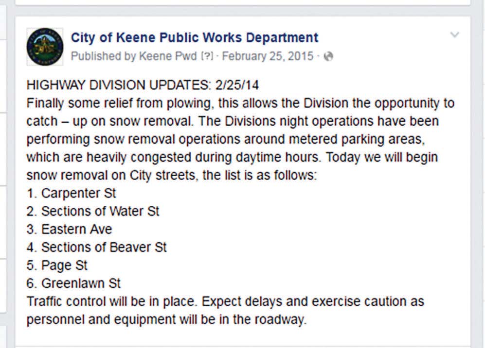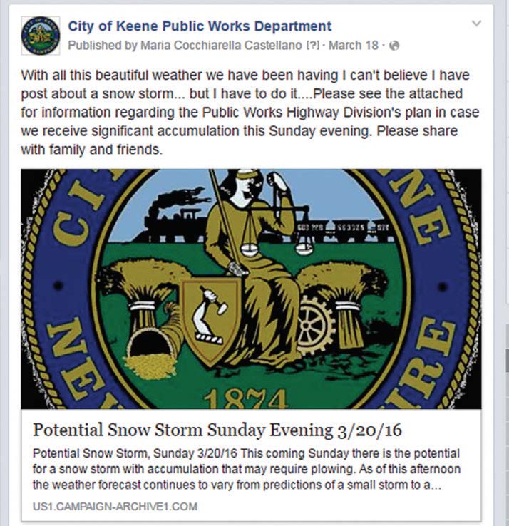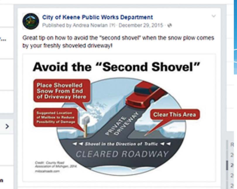 My department recognized that the traditional methods of communication were not being as effective as we wanted. In 2011 the Department developed a social media strategy and began with our Facebook page, facebook.com/keenepublicworks/. Several years later we integrated other platforms, including twitter, @KeenePWD; Instagram; and a YouTube channel — all with the purpose of getting our story out to our customers.