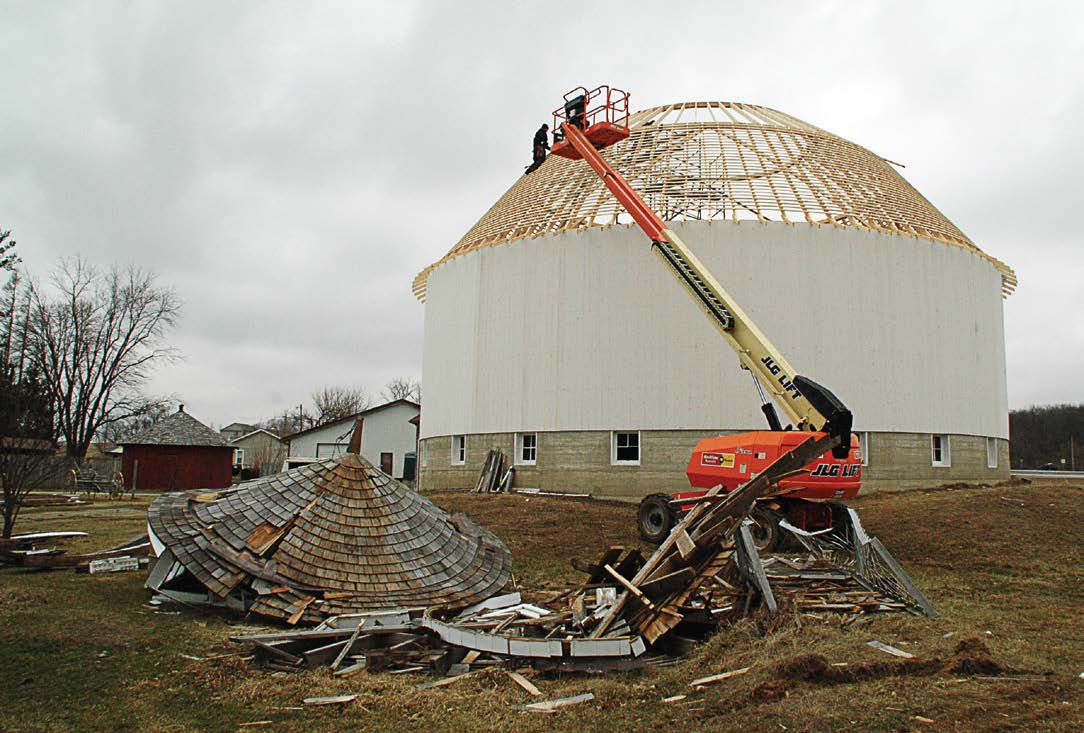 The 60-foot diameter barn was constructed of 1-inch lumber soaked in a nearby creek to make it pliable for assembly.