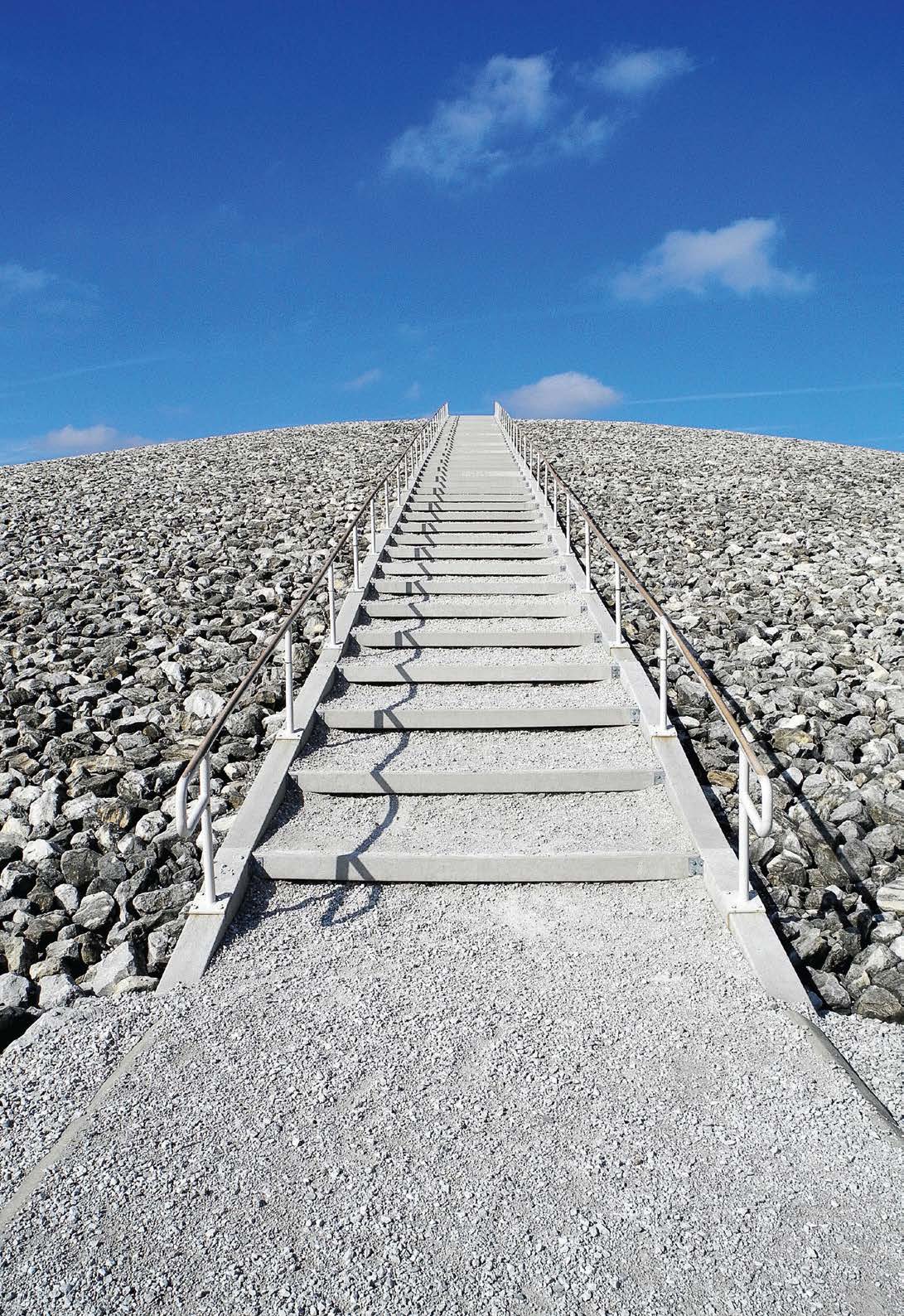 A concrete stairway leads to the summit, which is bedecked with benches and monuments detailing the history and specifications of the site.