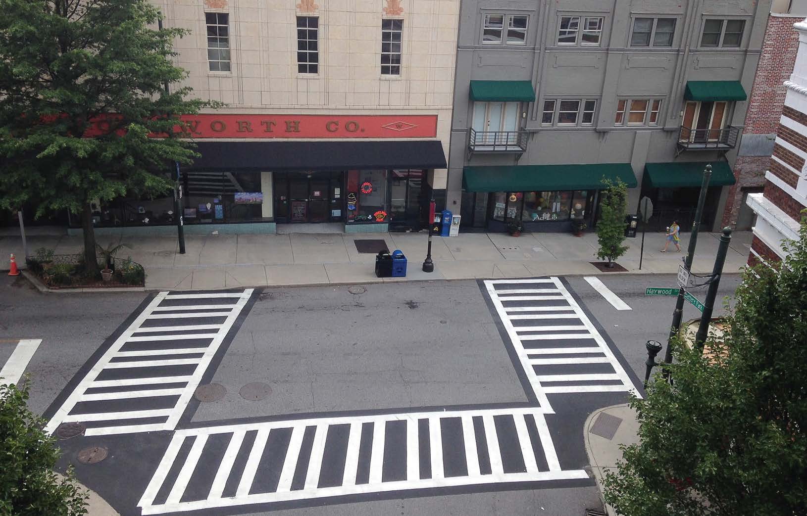 These are called ladder-type crosswalk markers, said City Traffic Engineer Jeff Moore. One high-profile area where they’ve been installed is at the intersection of Haywood Street and Battery Park Avenue. He added, “This location has more pedestrians than vehicles.”