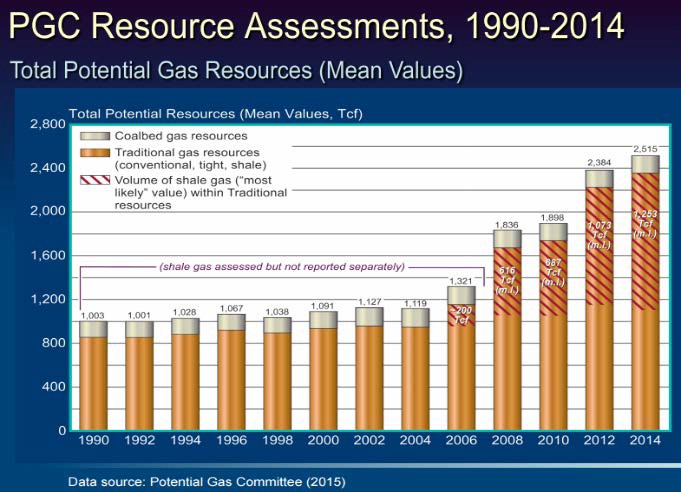 - Figure 1: ColoradoSchool of Mines Potential Gas Committee Resource Assessment 1990-2014 Natural gas reserves are estimated at ~2884 trillion cubic feet (Tcf). Annual U.S. consumption is ~27 Tcf/ year, indicating a 100+ year supply. Note the impact of shale gas additions from multiple basins since 2006. Abundant, distributed supplies facilitate ability to respond to demand and contribute to price stability.