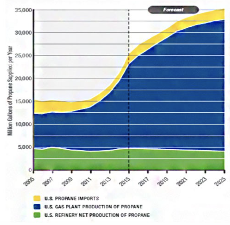 - Figure 2: U.S. Historical and Forecasted Propane Supply (Chart provided courtesy of IFC, 2016 Propane Market Outlook, PERC) Note the tremendous increase in propane from natural gas liquids processing that began in 2010. This shift in supply portfolio has had a stabilizing impact on propane autogas pricing.