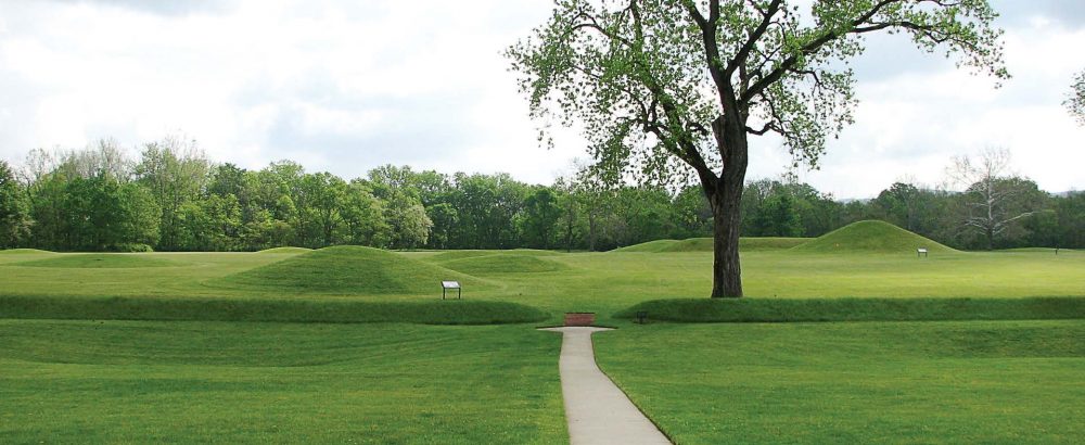 - The entrance to Hopewell Mound Group, a Native American burial ground 3 miles north of Chillicothe. The earthen ridge stretches 2,050 feet on a side and encases a square parcel of land containing 23 burial mounds dating from 200 B.C. to the fourth century. (Photo provided)