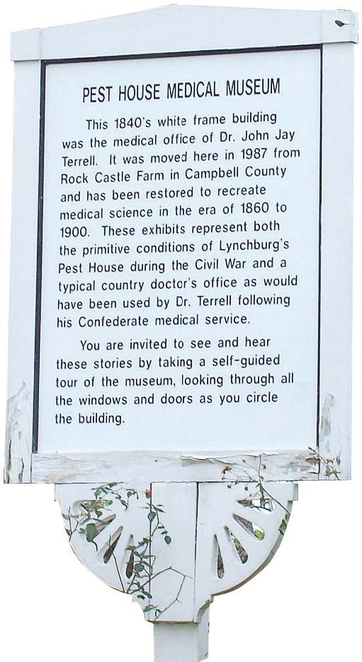 - A wooden sign beckons visitors to the Pest House Medical Museum, located in the Old City Cemetery near downtown Lynchburg, Va. (Wikimedia Commons)