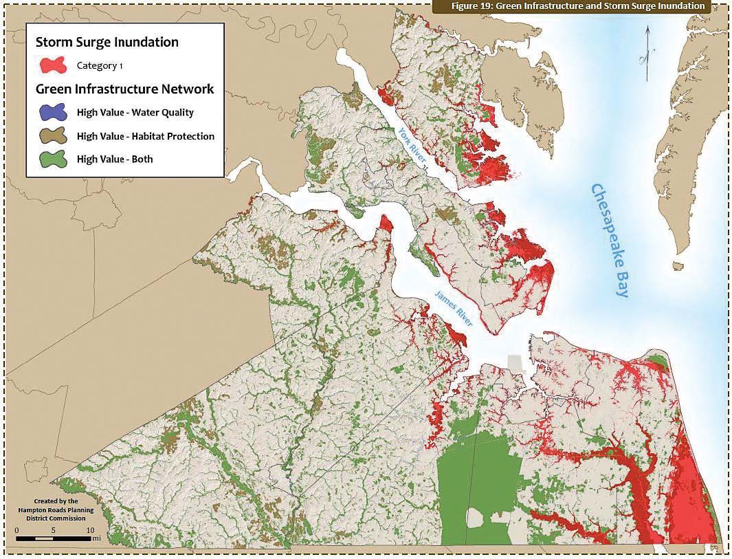 - The rate of sea level rise in Virginia is somewhere between 5 and 6 millimeters per year, which is almost twice the global rate. Pictured is a green infrastructure and storm surge inundation map of Virginia created by the Hampton Roads Planning District Commission. (Photo provided)
