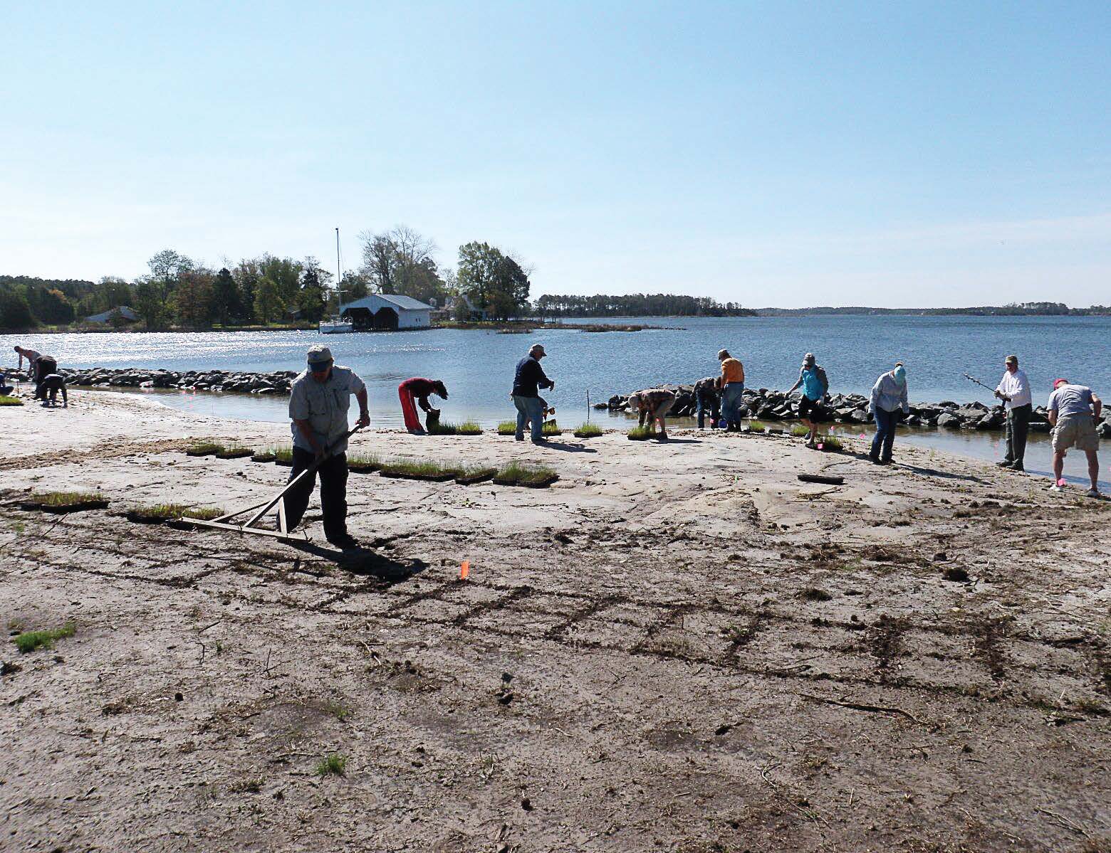 - Volunteers plant marsh grasses on an unprotected beach. Coastal marshes can help protect against the effects of sea level rise. (Photo provided)