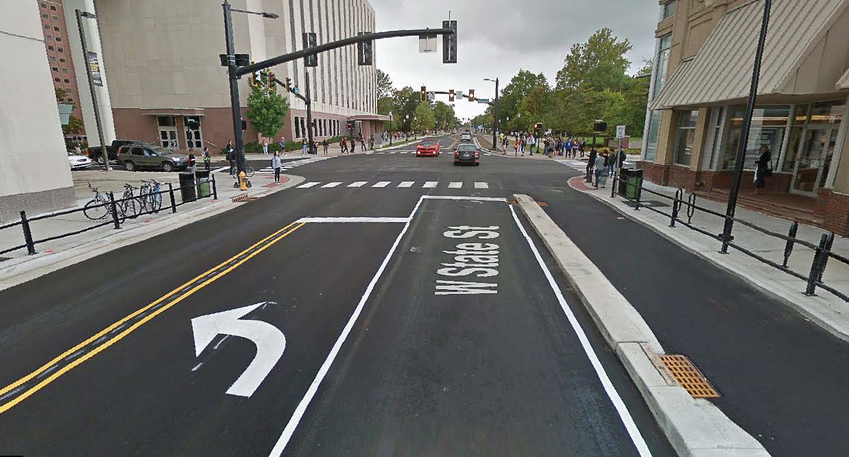 - Pictured is the new two-way State Street in West Lafayette going toward Purdue University’s campus. With State Street being the main roadway going through campus, the change to a two-way creates a more welcoming impression. (Photo via Google Maps)