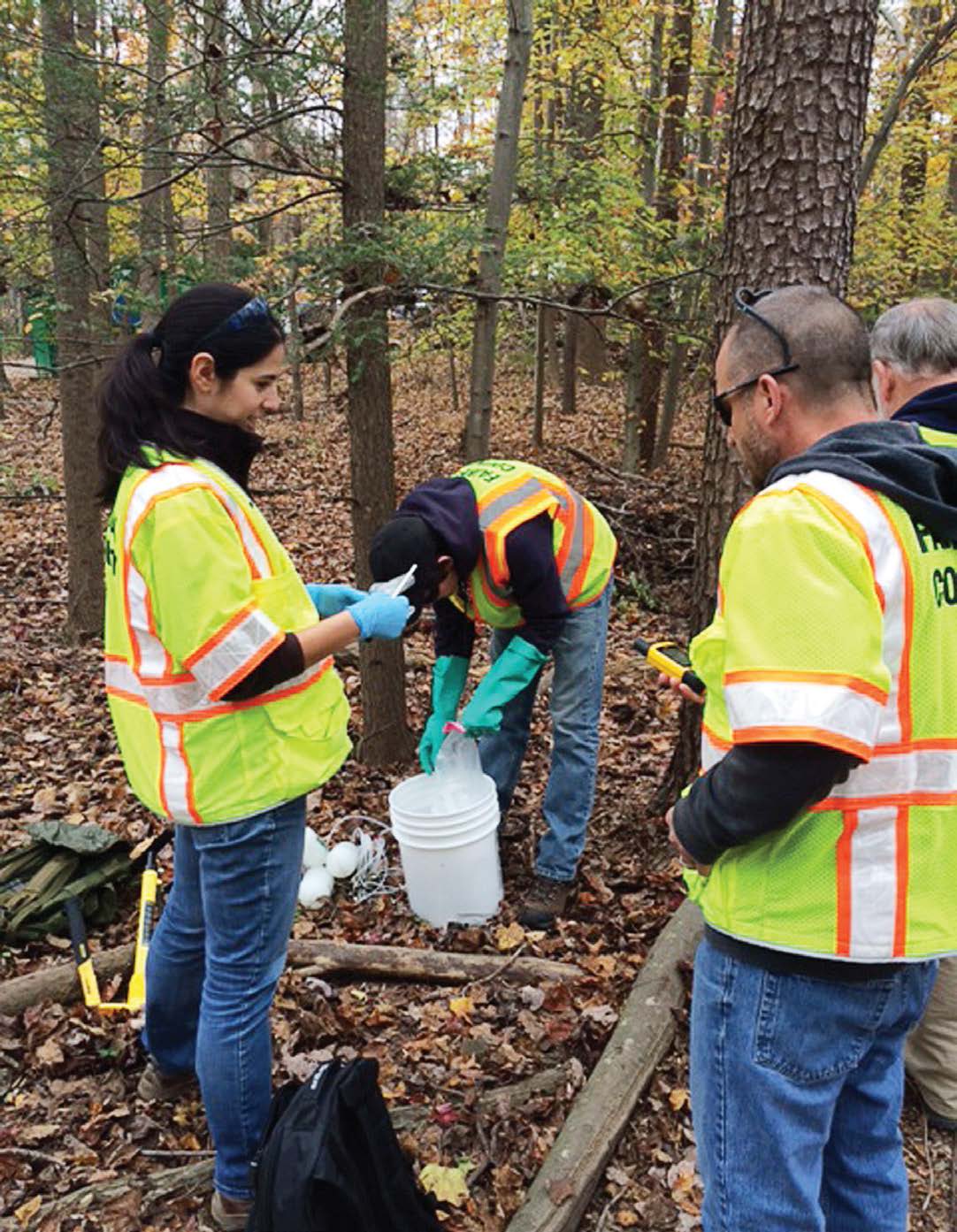 Fairfax County, Va., urban foresters climb a slope to monitor some hemlocks in the county. (Photo provided)