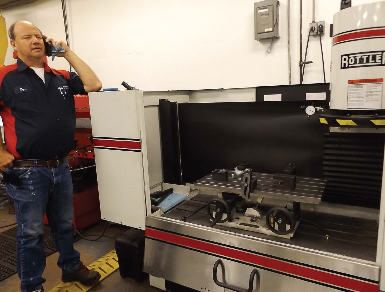 - Tom Rohr, owner-operator of Advance Engine in Plymouth, Ind., takes a call while standing next to the Rottler Manufacturing CNC resurfacing machine his shop got last year. (Photo by Denise Fedorow)