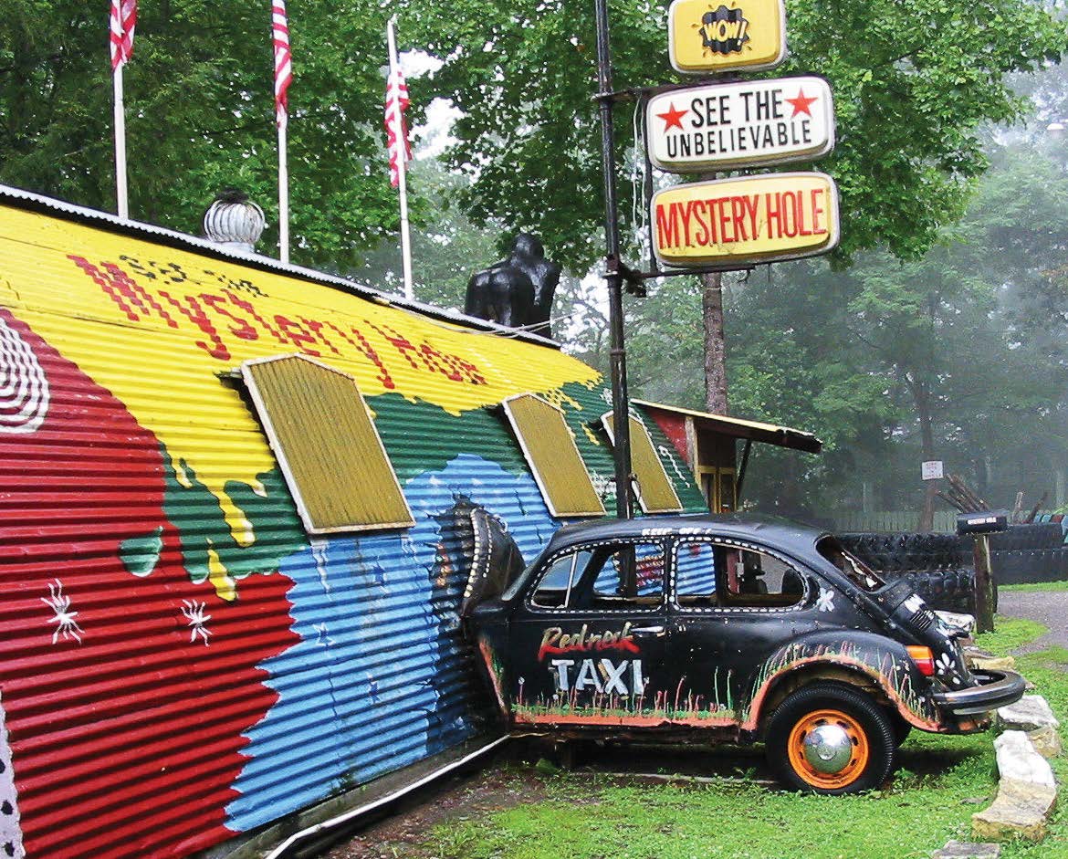 The site’s kaleidoscopic jumble of colors and incongruous images match the delightful hyperbole of the attraction’s website. Depictions of a clown and black bear greet visitors to the rainbow-colored quonset hut and the adjoining gift shop and a Volkswagen Beetle is placed so it appears to have crashed into the building.