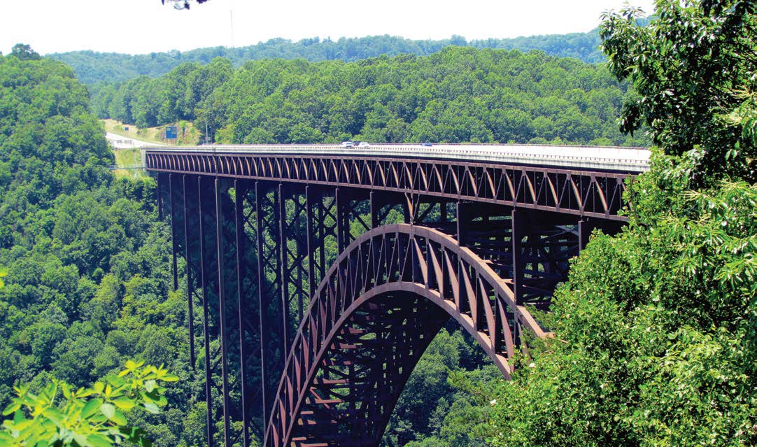 - The New River Gorge Bridge, one of the world’s longest and highest steel arch bridges, spans the New River in the Appalachian Mountains a few miles southeast of The Mystery Hole. (bobistraveling via Flickr, creativecommons.org/licenses/by/2.0/)