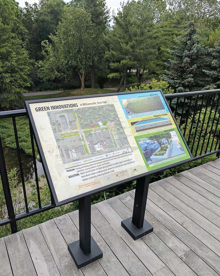 - A sign that explains the problem, changes and solutions sits atop the overlook at Glen Park. It outlines the green innovations the village completed in order to better its stormwater management. (Photo provided by the village of Williamsville)