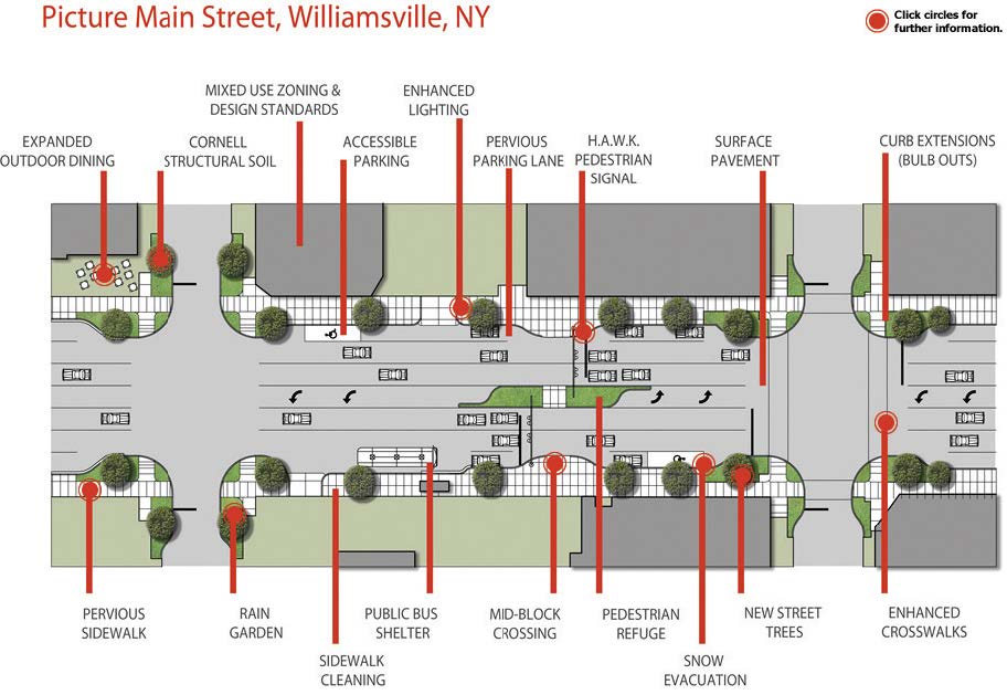 - This design shows the various changes along the road for the Picture Main Street initiative. These not only included rain gardens but also new crosswalks, sidewalks, street lighting and more. (Photo provided by the village of Williamsville)