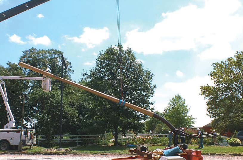 - Workers from Bolin Enterprises are dwarfed by the 60-foot pitchfork as they install it on a farm property just outside of town. (Photo provided)