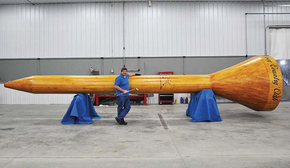 - Jim Bolin, mastermind behind the “Big Things in a Small Town,” poses with the world’s largest golf tee. (Photo provided)