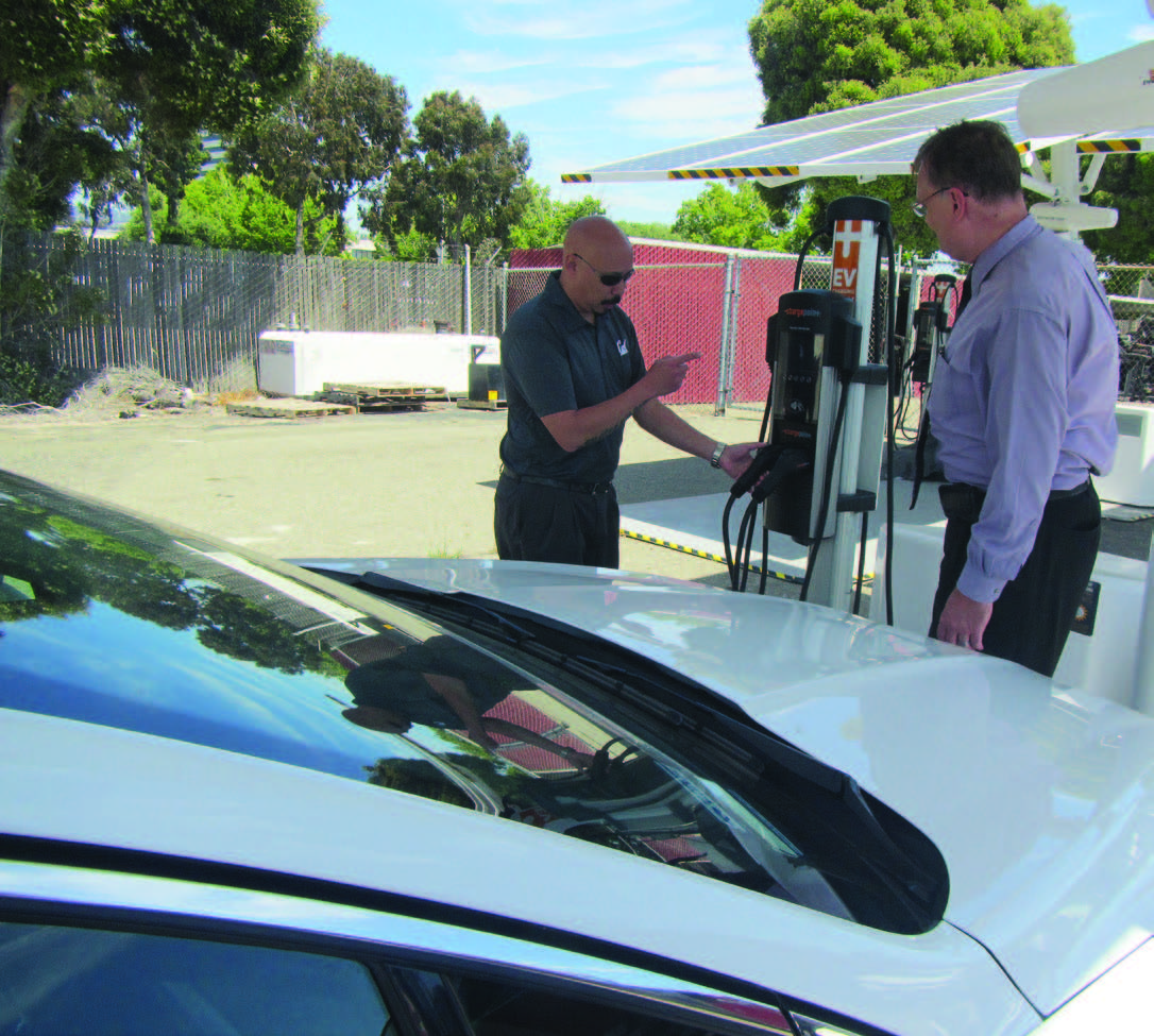 - From left, Jason Chin, Oakland’s fleet compliance coordinator, and Richard Battersby, interim assistant director of Oakland’s bureau of infrastructure and operations, check out one of the EV ARC self-contained, solar-powered Level 2 charging stations. Electric cars charged at it will be using 100 percent renewable fuel. (Photo provided)