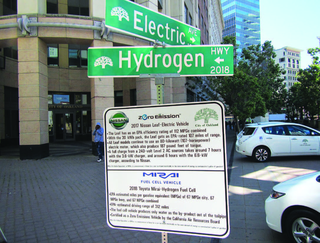 - A sign educates citizens on Oakland’s electric and hydrogen vehicle programs. (Photo provided)
