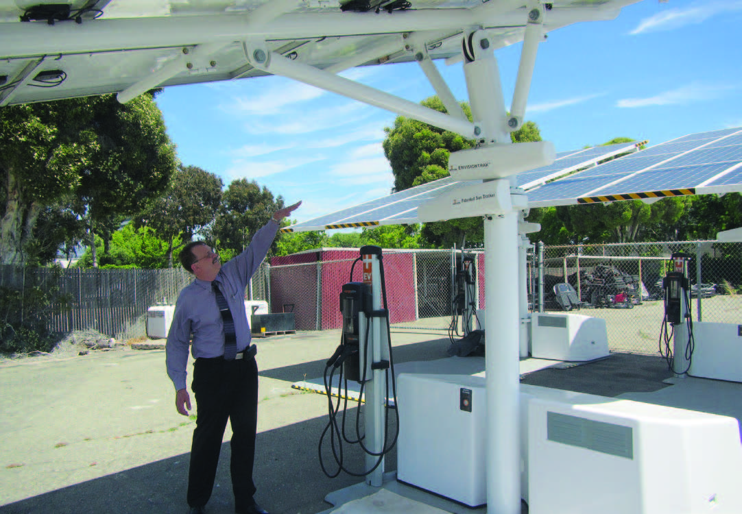 - Interim Assistant Director of the Bureau of Infrastructure and Operations Richard Battersby feels the benefits of solar energy. While the units are expensive, they do guarantee that electric vehicles charged there are using 100 percent renewable energy. (Photo provided)