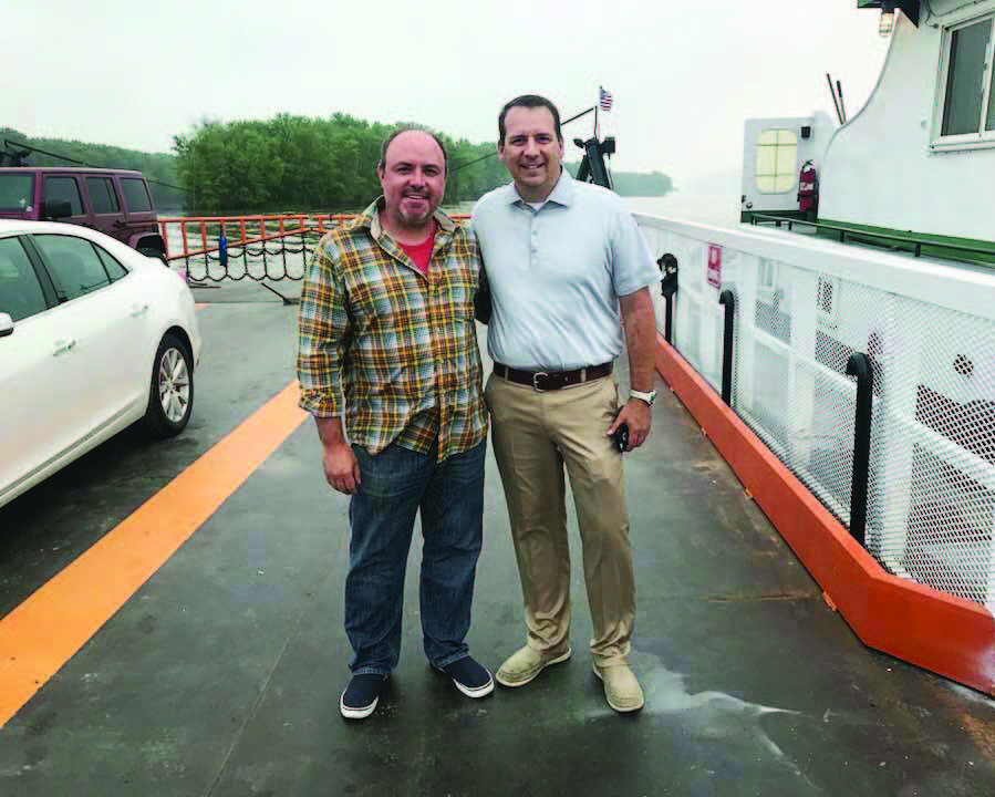 - When residents from both Sabula, Iowa, and Savanna, Ill., began to discuss the need for a ferry, the two mayors started working together to solve the problem. Pictured are Savanna Mayor Chris Lain, left, and Sabula Mayor Troy Hansen taking a trip across the Mississippi River on the ferry. The Iowa Department of Transportation ended up taking responsibility for the ferry, paying for the trips back and forth between the cities. (Photo provided by the city of Savanna, Ill.)