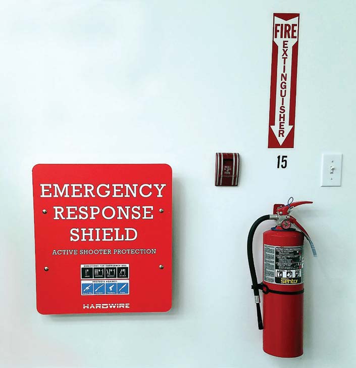 - Much like a fire extinguisher, an emergency response shield can be placed in a building in case of an active shooter. They can be labeled as such, above right, or concealed as artwork or an advertisement, like this “Seacrets Hand-Crafted Gin” sign, above left. (Photo provided by Hardwire)