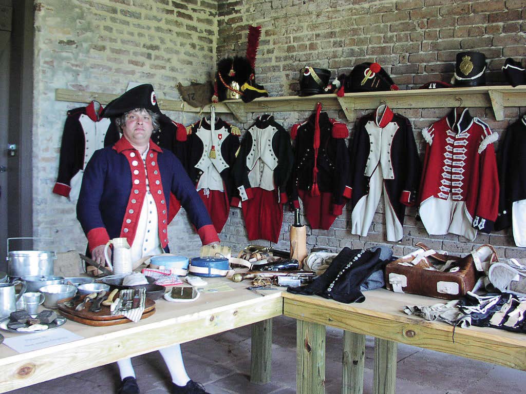 - A Fort Gaines re-enactor displays colonial apparel and other memorabilia.