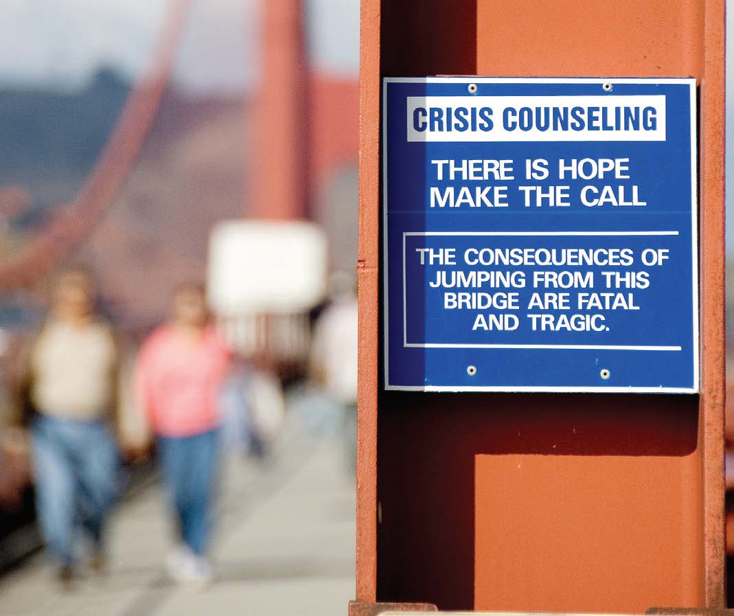 - A suicide prevention notice posted on the Golden Gate Bridge. In addition to fencing, suicidal hotline signage can make a difference in suicide prevention. (Shutterstock.com)