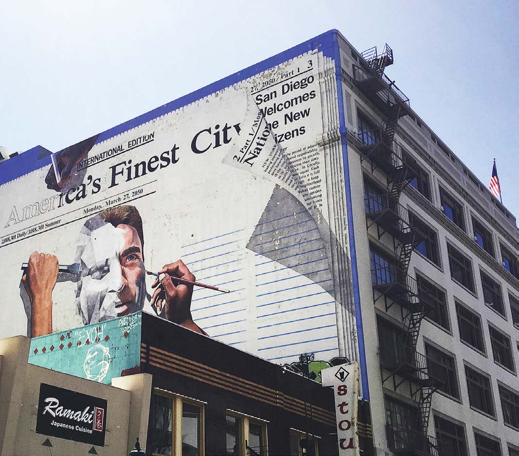 - A newspaper article about how San Diego, Calif., is welcoming its immigrants goes up on the side of a building in the city. (Photo provided by Welcoming San Diego)