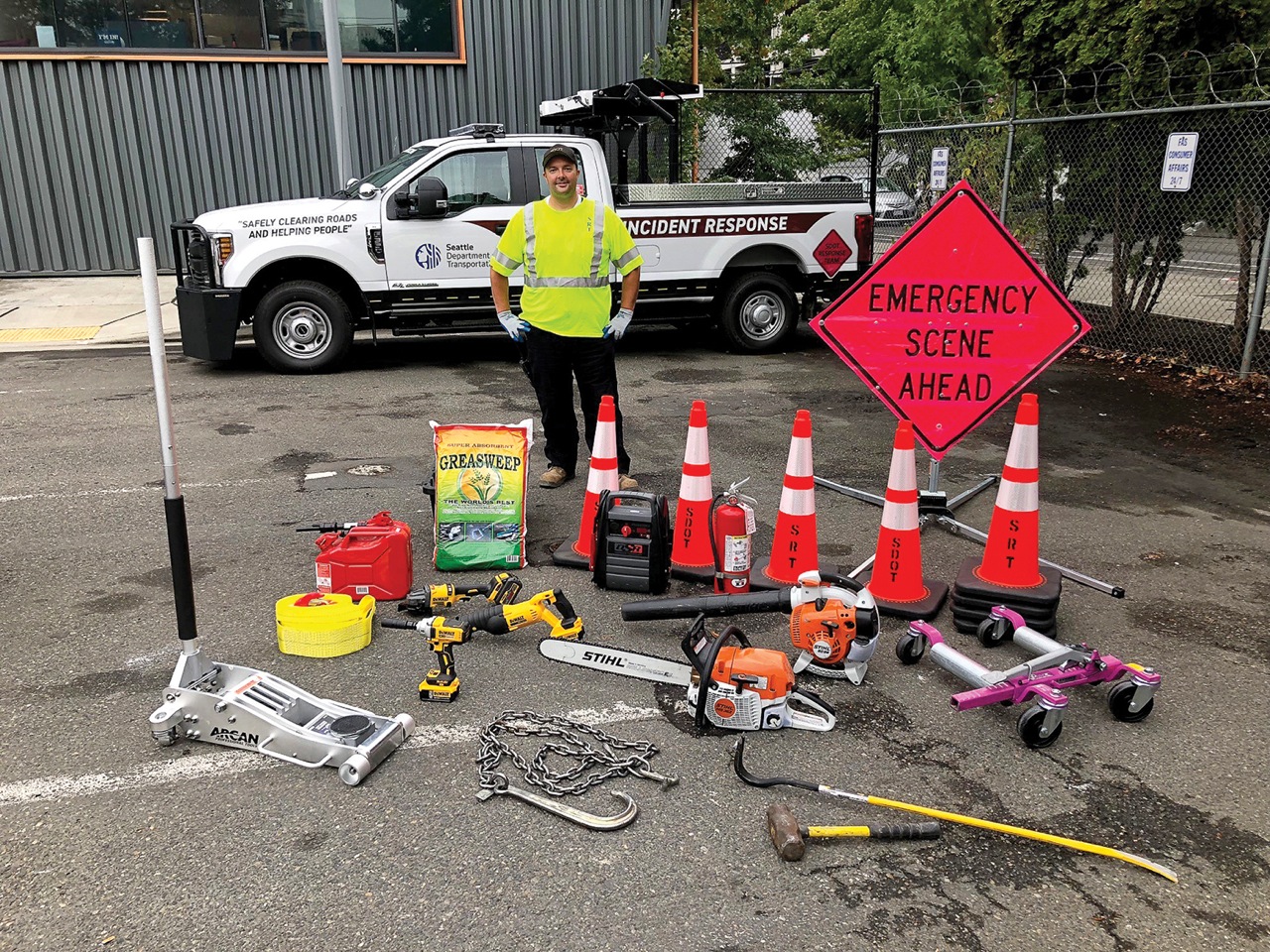 - A member of the SRT displays the various tools that they use in order to keep traffic moving when an incident occurs. Each member must undergo training so they know how to properly use this equipment. (Photo provided by Seattle Department of Transportation)