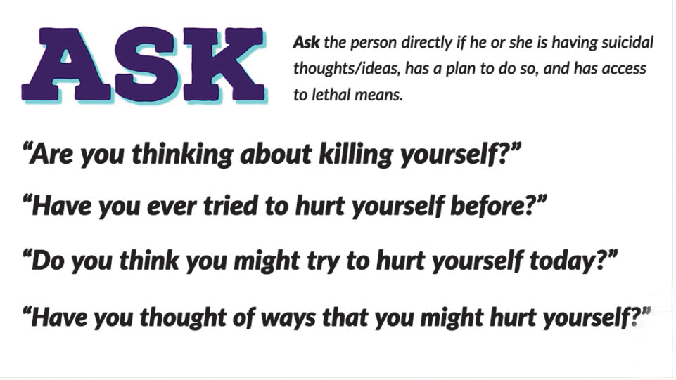 - Developers of the “Start the Conversation” documentary encourage those who believe someone they know may be contemplating suicide to ask four